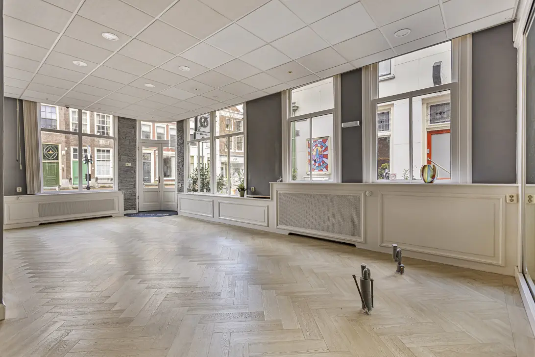 De eerste voordeur ligt op de hoek van de Groenesteeg en de Hooigracht en heeft een prachtige geboogde deur en bovenramen. Zo zie je ze nog maar weinig in het stadsbeeld! Hier was tot voor kort de entree voor de kapperszaak die op de begane grond was gevestigd. Uiteraard zou je hier weer een eigen zaak kunnen vestigen, maar de ruimte leent zich met de grote raampartijen en lichtinval ook voor een fantastische woonkeuken.