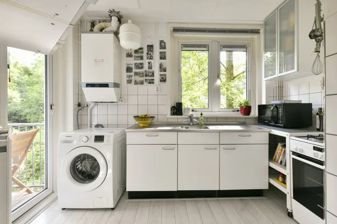 Grote slaapkamer aan de voorzijde met dubbele openslaande deuren naar het balkon van ruim 5 meter breed op het westen (zon vanaf 12 uur tot einde middag). Keuken aan de achterzijde met de cv-ketel, aansluiting voor de wasmachine en een groot raam boven het aanrecht met zicht op groen. Vanuit de keuken toegang naar het balkon op het oosten. De keuken is eenvoudig maar het is zo'n leuke plek in het huis met al dat licht en groen!