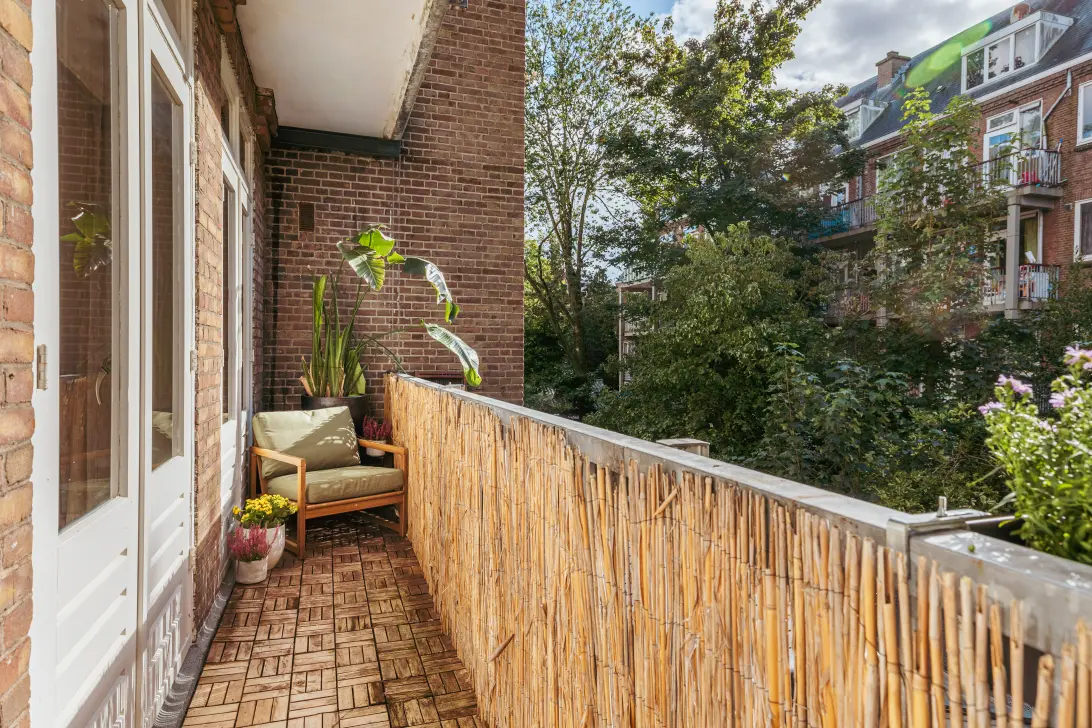 Hier geniet je van de middag- en avondzon met uitzicht op de binnentuinen, een rustige en groene plek om de dag af te sluiten.
