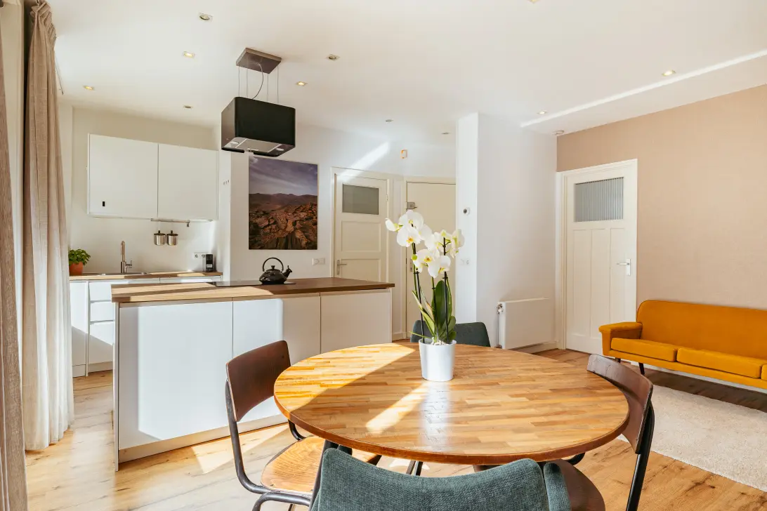 De open keuken is slim ingedeeld met een modern kookeiland en voelt als een gezellige woonkeuken. Voorzien van een elektrische kookplaat met afzuigkap, oven, vaatwasser en koelkast is dit de ideale plek om uitgebreid te koken en samen te tafelen.