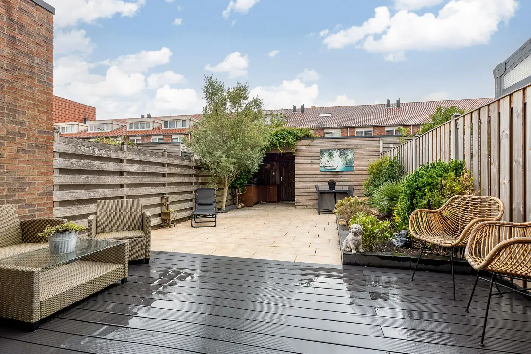 De woning beschikt over een prachtige, goed onderhouden tuin van 65m2 met een zuidwestelijke ligging, ideaal voor zonnige middagen en avonden buiten. De tuin is bereikbaar vanuit de woonkamer via schuifdeuren en heeft ook een achterom. Daarnaast is er een vrijstaande houten berging met elektriciteit en een veranda.