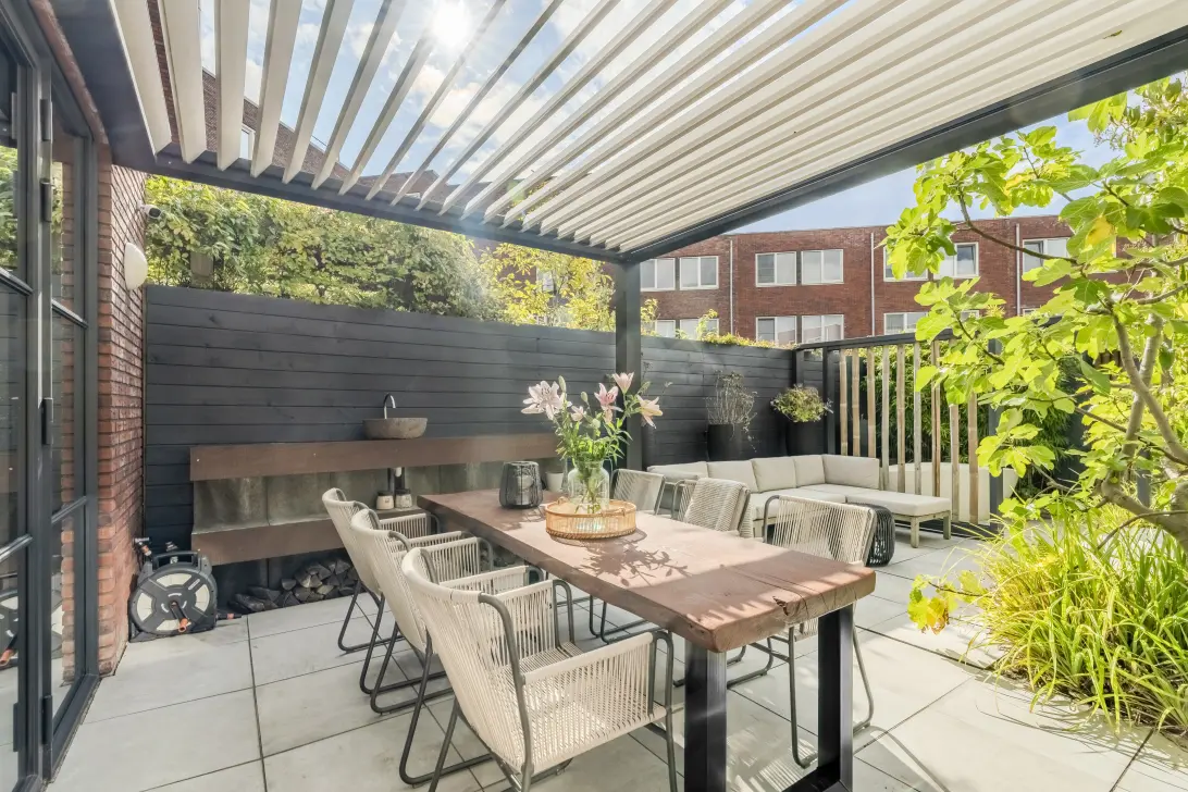 De tuin is professioneel en onder architectuur aangelegd: strak, onderhoudsvriendelijk en voorzien van groene elementen die privacy en rust creëren. Door de openslaande deuren en gunstige zonligging is het hier heerlijk vertoeven, met zelfs nog een elektrische overkapping. Daarnaast maken een buitenbad, een flinke houten berging, de mogelijkheid voor een buitendouche, het geheel af.