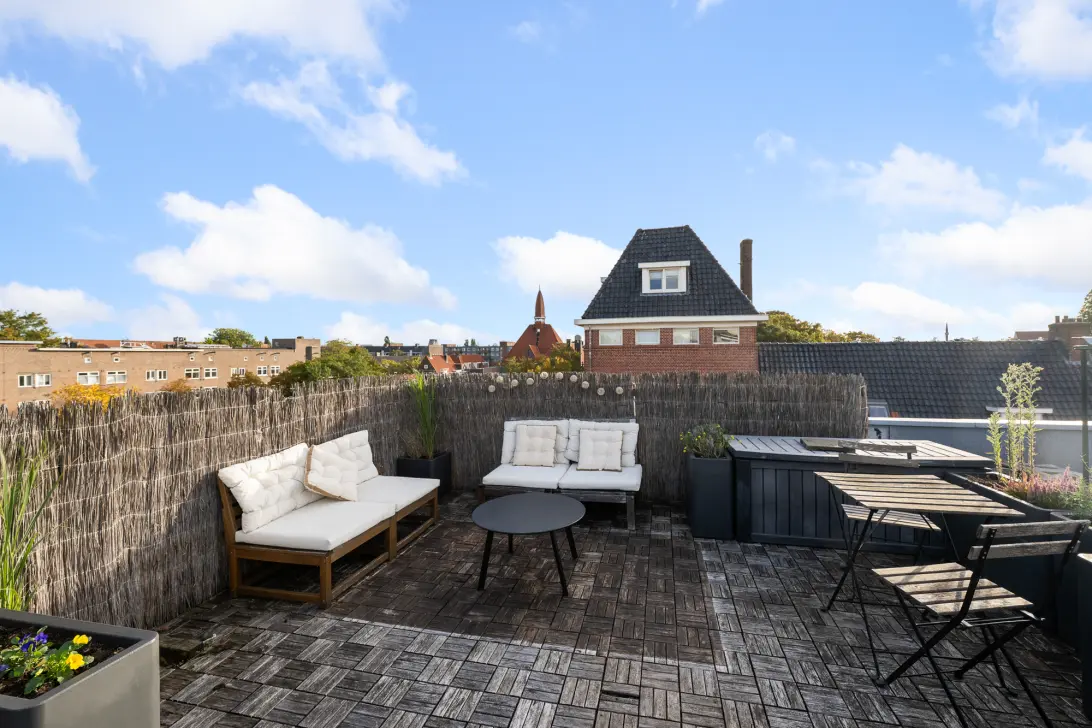 Via het gezamenlijke trappenhuis kom je bij het royale, zonnige, privé dakterras.
