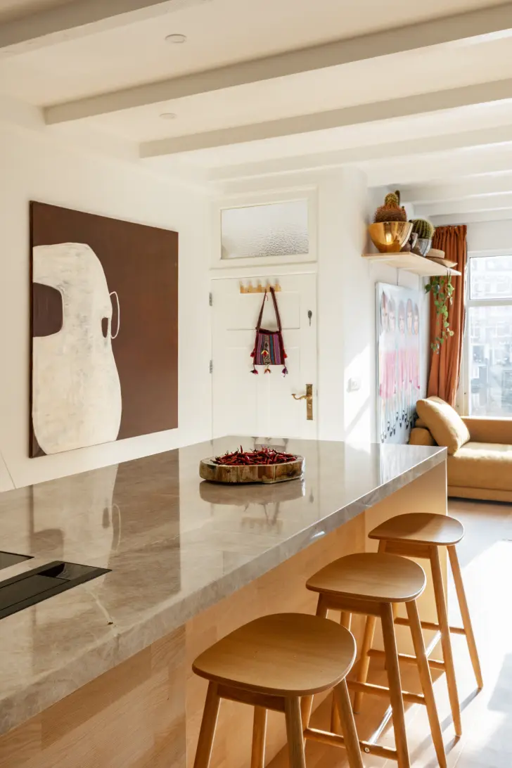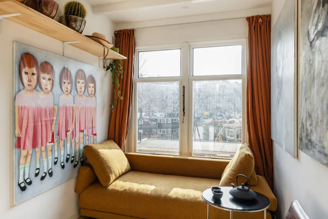 De lichte woonkamer kijkt direct uit over de gracht en de karakteristieke woonboten. Aan de voorzijde van het pand staat op de stoep bovendien een vaste bank met tafel, ideaal om buiten te zitten en van de zon te genieten — alsof de stad je eigen voortuin is.