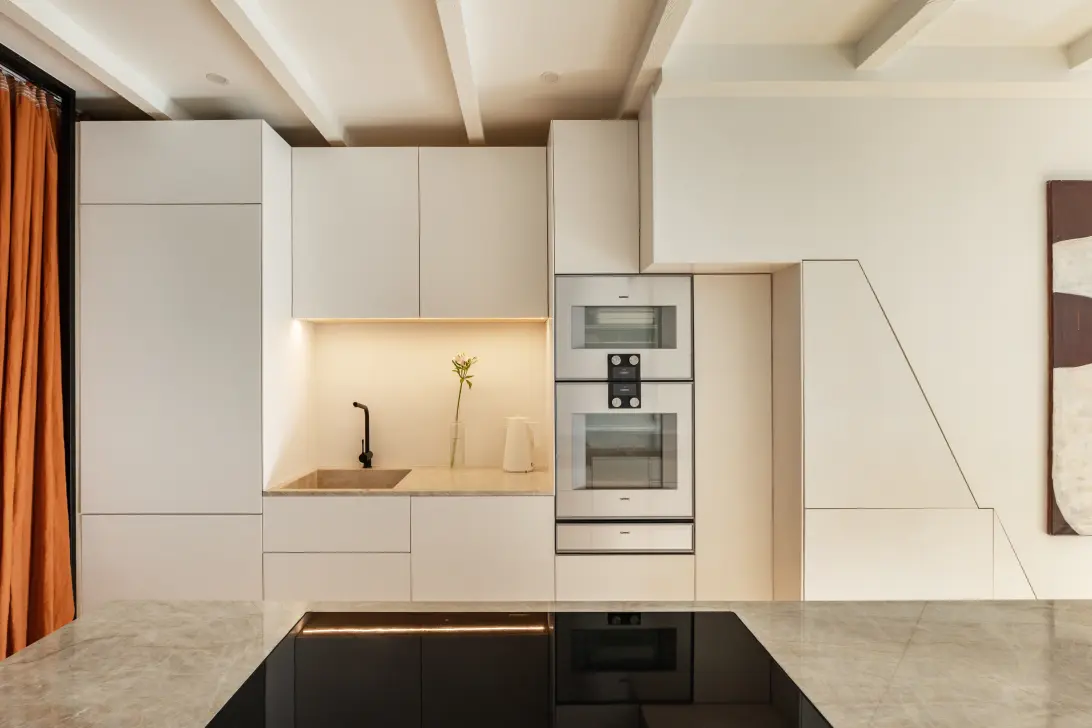 De eigenaar is chef-kok, en dat zie je. De ruime, volledig uitgeruste keuken is voorzien van een kookeiland in travertin met Corian afwerking en uitsluitend topapparatuur van Gaggenau: oven, stoomoven, kookplaat, koelkast, vaatwasser, afzuigsysteem, vacumeermachine én een wijnklimaatkast. Een droomkeuken voor iedereen die van koken houdt.
