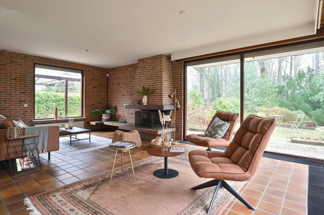 * Zeer royale en lichte woonkamer, voorzien van meerdere glazen (schuif) puien en een open haard
