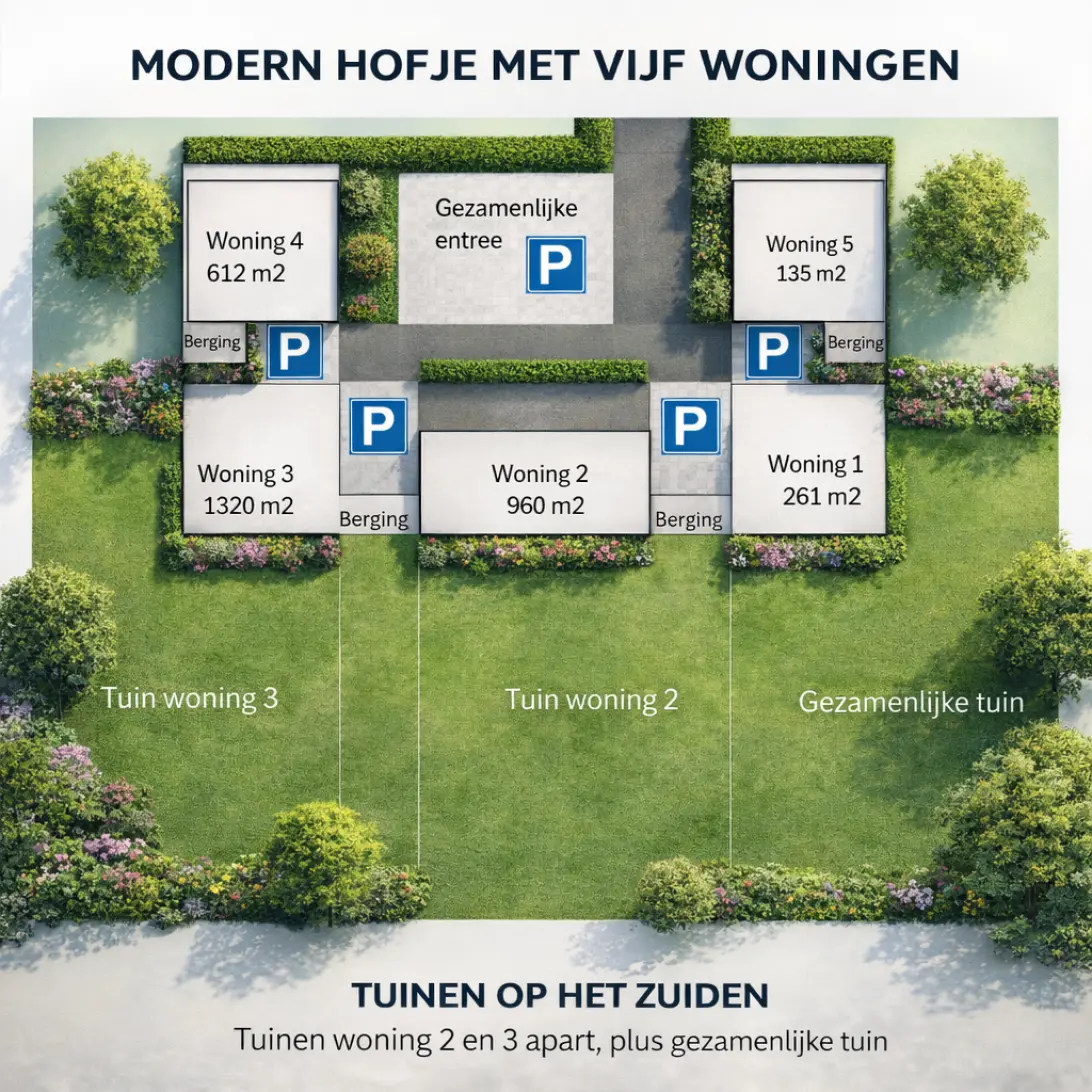 Alle woningen zijn verbonden door een gezamenlijke entree met een poort, toegangsweg, groen en een gazon/gras¬tegels/voetbalveldje/speeltuin. En er is naast een eigen tuin ook een gezamenlijke tuin. De precieze invulling kan met elkaar bepaald worden.