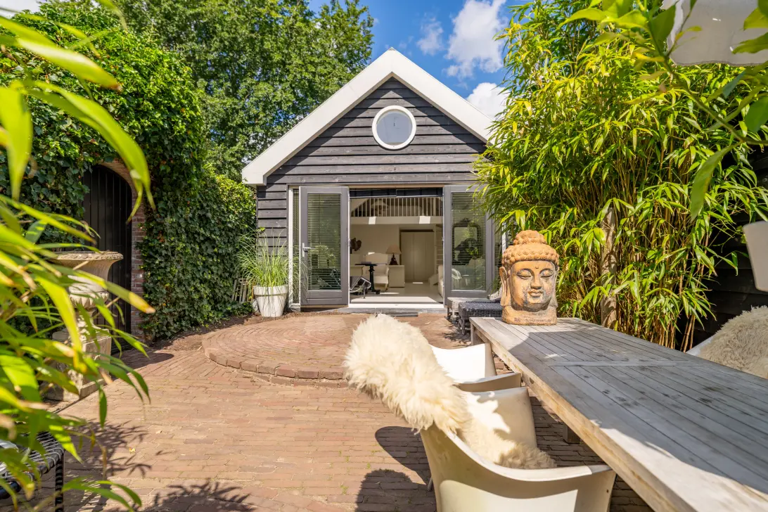 Achterin de tuin staat een prachtig bijgebouw in gebruik als mantelzorgwoning: licht, modern en comfortabel. De woonkamer is voorzien van vloerverwarming en een sfeervolle gashaard. De mooie badkamer is voorzien van een inloopdouche, wastafel en toilet. Tevens is er een wasmachine-aansluiting en een eigen cv-installatie. Boven op de vliering bevindt zich een ruimte voor opslag en berging.