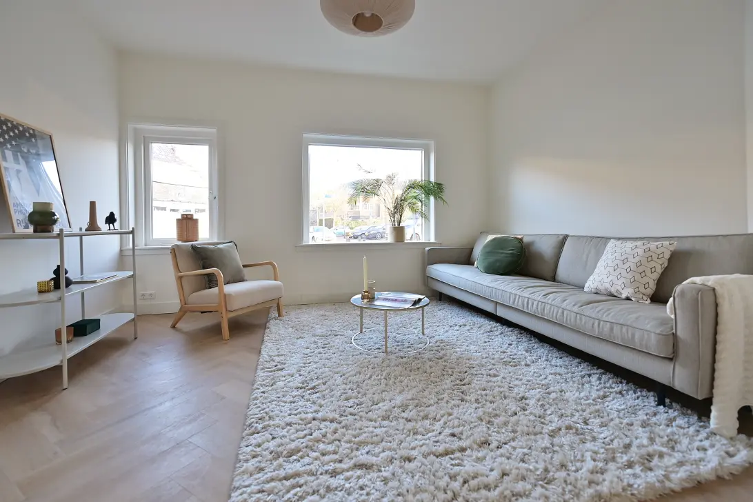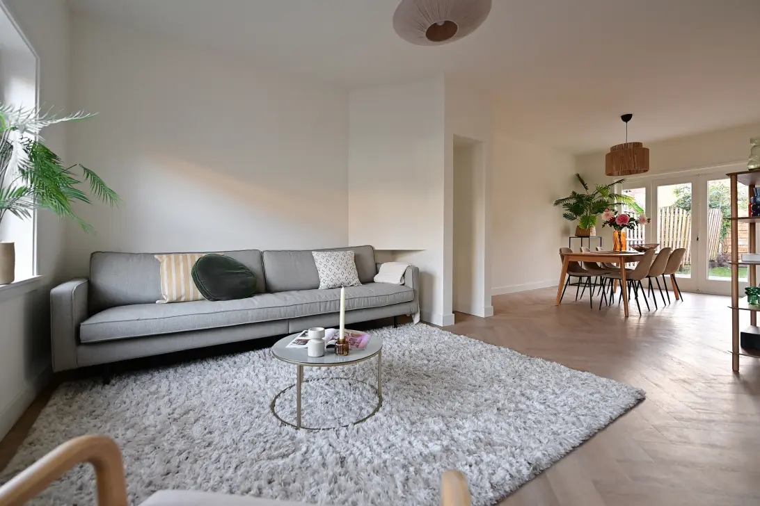 Via de entree kom je in de lichte en sfeervolle woonkamer, waar de hoge plafonds en grote raampartijen meteen in het oog springen. Dankzij de hoekligging en de extra ramen in de zijgevel is het huis heerlijk licht, de hele dag door.