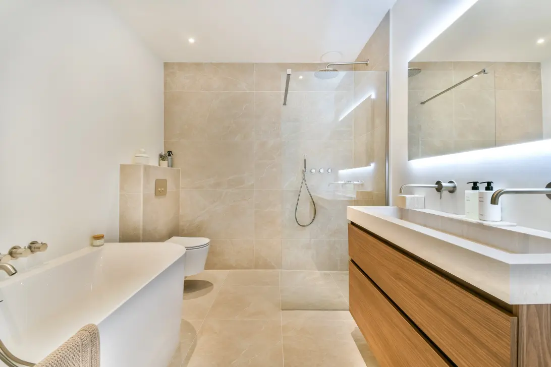 De moderne badkamer is compleet uitgevoerd met een ruime inloopdouche, ligbad, toilet, dubbel wastafelmeubel met twee kranen, een spiegel met verlichting en mechanische ventilatie. Ook op deze verdieping is vloerverwarming aanwezig.