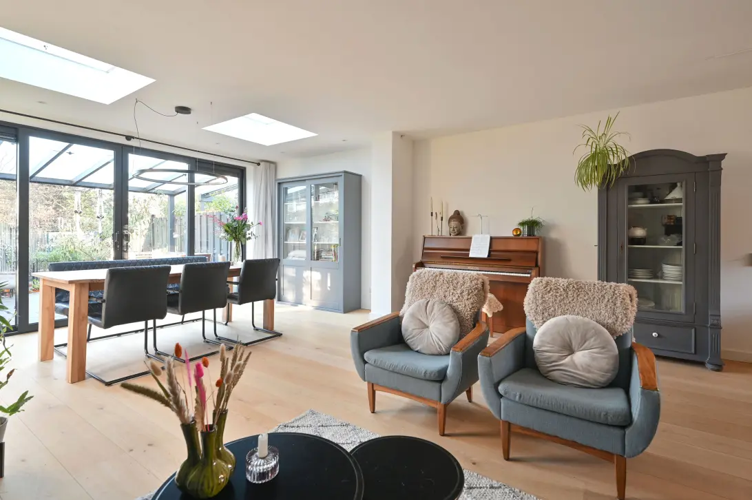 * Royale, uitgebouwde woonkamer met lichtkoepels en schuifdeuren aan zowel de achter- als zijkant.