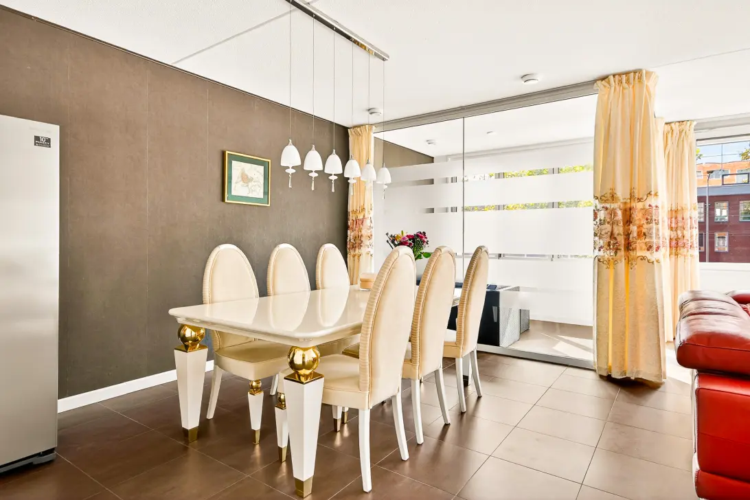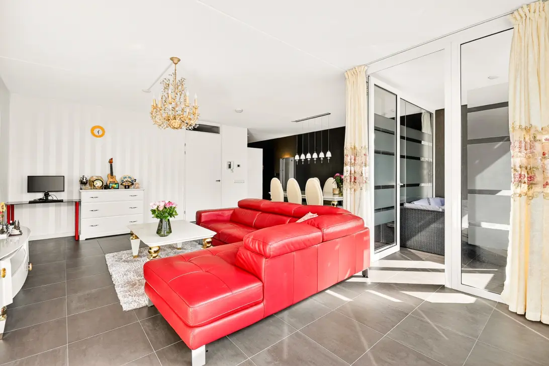 De woonkamer ligt aan de achterzijde en is heerlijk licht. De donkere tegelvloer in combinatie met de vloerverwarming geeft de ruimte een moderne en comfortabele uitstraling. Via de schuifdeur stap je zo de loggia op, gelegen op het zonnige zuiden. De halfopen keuken is voorzien van een koelruimte, keramische kookplaat, oven en een Bosch-vaatwasser. De ingebouwde koelkast heeft alleen een koelgedeelte; de losse Amerikaanse koelkast met vriezer is eventueel ter overname.