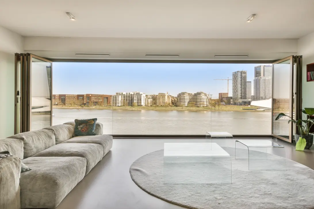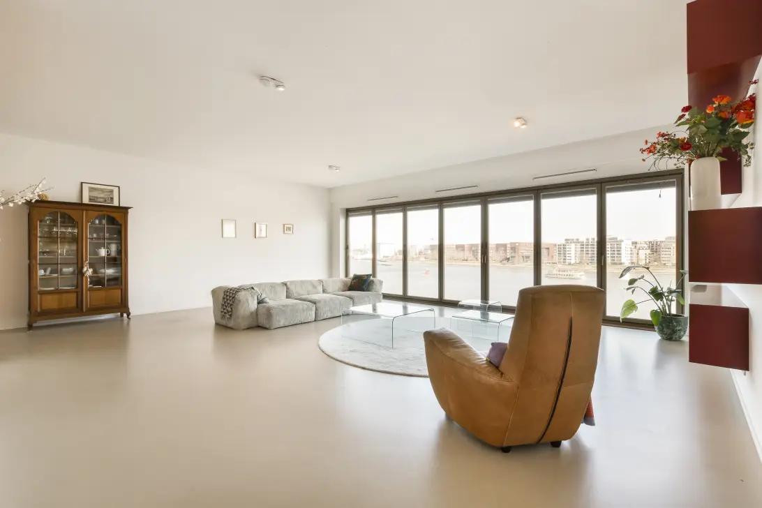 Bij binnenkomst in de hal word je gelijk gevangen door het prachtige uitzicht over het brede IJ. De glazen pui aan waterzijde kan geheel opengevouwen worden, binnen en buiten gaan naadloos in elkaar over. Het uitzicht strekt zich uit van NDSM, Het Filmmuseum en de Amsterdam toren tot bijna Centraal Station, werkelijk panoramisch. Het appartement heeft hoge plafonds en een gietvloer met vloerverwarming en het geheel is ruimtelijk ingedeeld, groots van opzet.