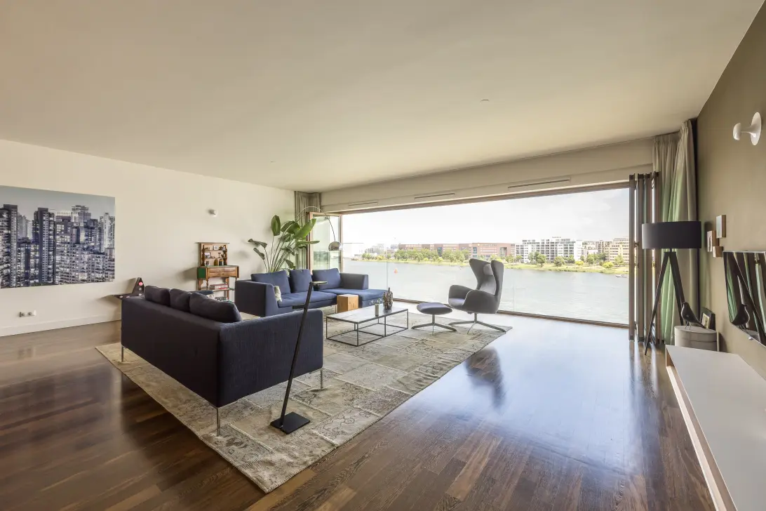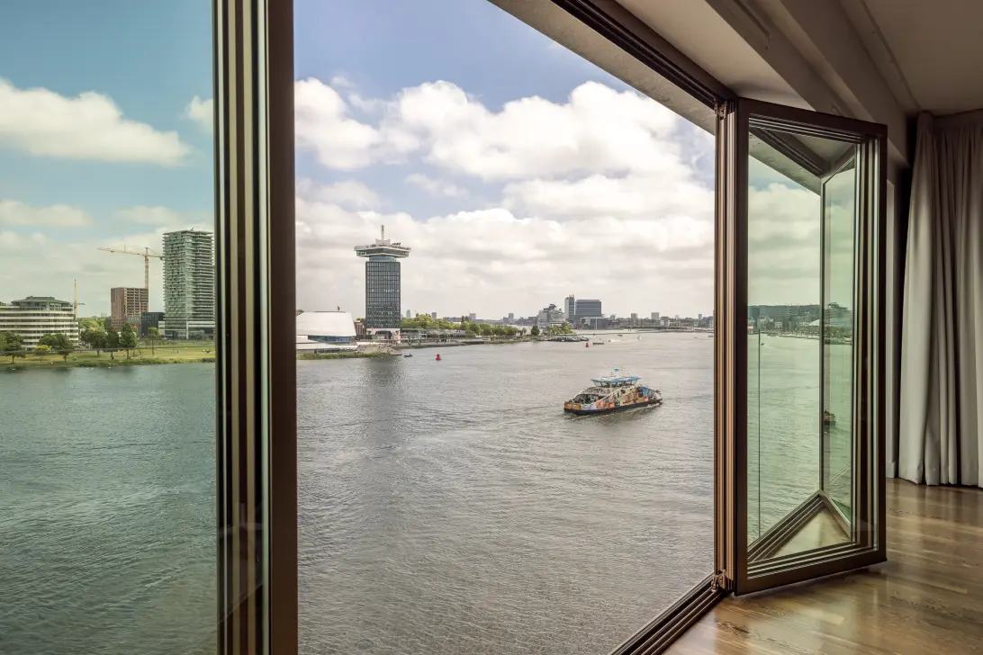 The living area instantly impresses, thanks to expansive windows offering sweeping views over the IJ and ceilings reaching approximately 3 meters high. This sense of space is amplified by the beautiful wooden flooring. The loft-style living room on the IJ side is divided by a decorative wooden wall. An aluminum “four-season” sliding façade allows the entire IJ-facing wall to open, offering a true indoor-outdoor experience.