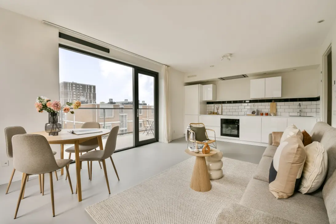 De woonkamer bevindt zich aan de achterzijde van het complex en is ruim en licht dankzij de grote raampartijen. De open keuken sluit naadloos aan op de woonkamer en is modern uitgevoerd met diverse inbouwapparatuur, waaronder een Quooker.