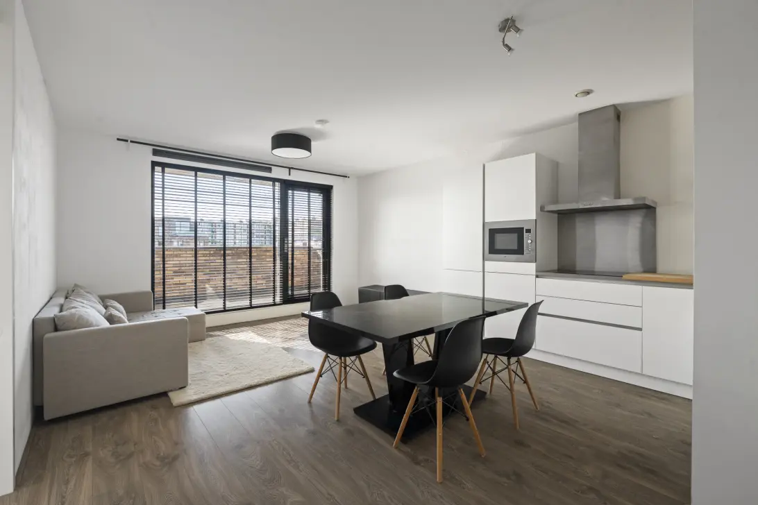The open kitchen is equipped with all conveniences, including an induction hob with extractor hood, a dishwasher, a combi-oven/microwave, and a large fridge-freezer. The spacious bedroom is directly adjacent to the bathroom. This has a modern finish and features a walk-in shower, a washbasin, and a designer radiator. There is also a separate toilet and an indoor storage room where the washing machine is located.