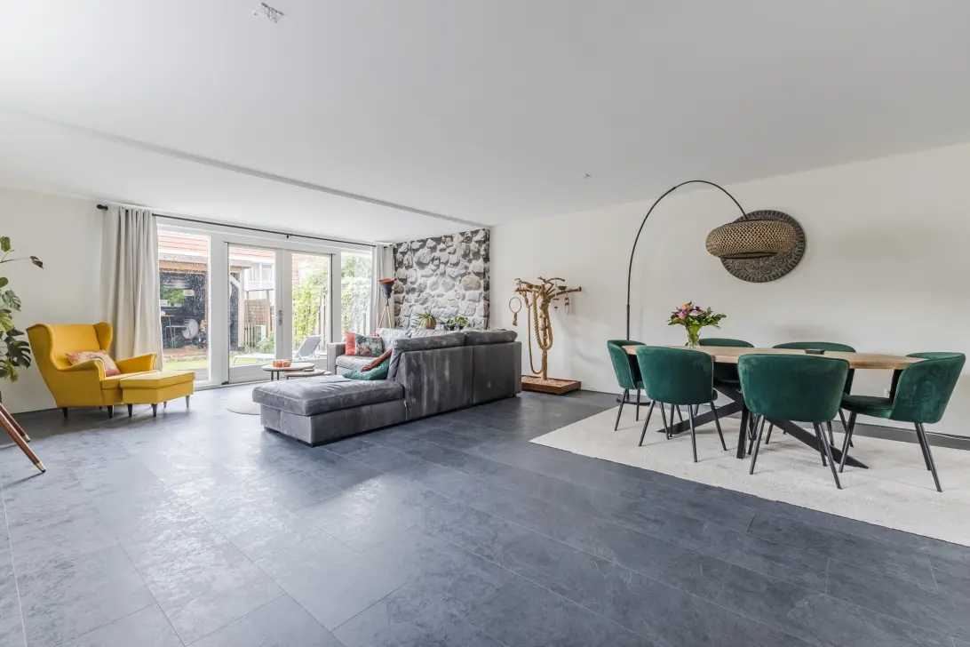 De donkere laminaat tegelvloer uit de hal loopt door in de woonkamer. De ruime en sfeervolle woonkamer heeft aan de achterzijde een brede raampartij met openslaande tuindeuren en een zijraam. Hierdoor valt er veel natuurlijk licht binnen.
