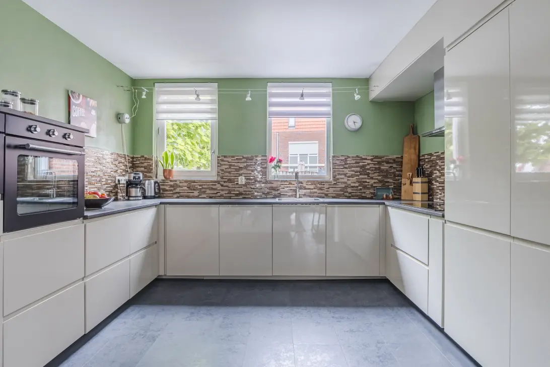 De grote open keuken bevindt zich aan de voorzijde van het huis. Deze is vernieuwd in 2018 en uitgevoerd in een U-opstelling. De keuken heeft een fraai design met witte keukenkastjes en een donker werkblad. Moderne apparatuur is er in de vorm van een vaatwasser (2025), oven, magnetron, kookplaat, afzuigkap, koelkast en vriezer. Er is volop kastruimte, waaronder diverse lades.