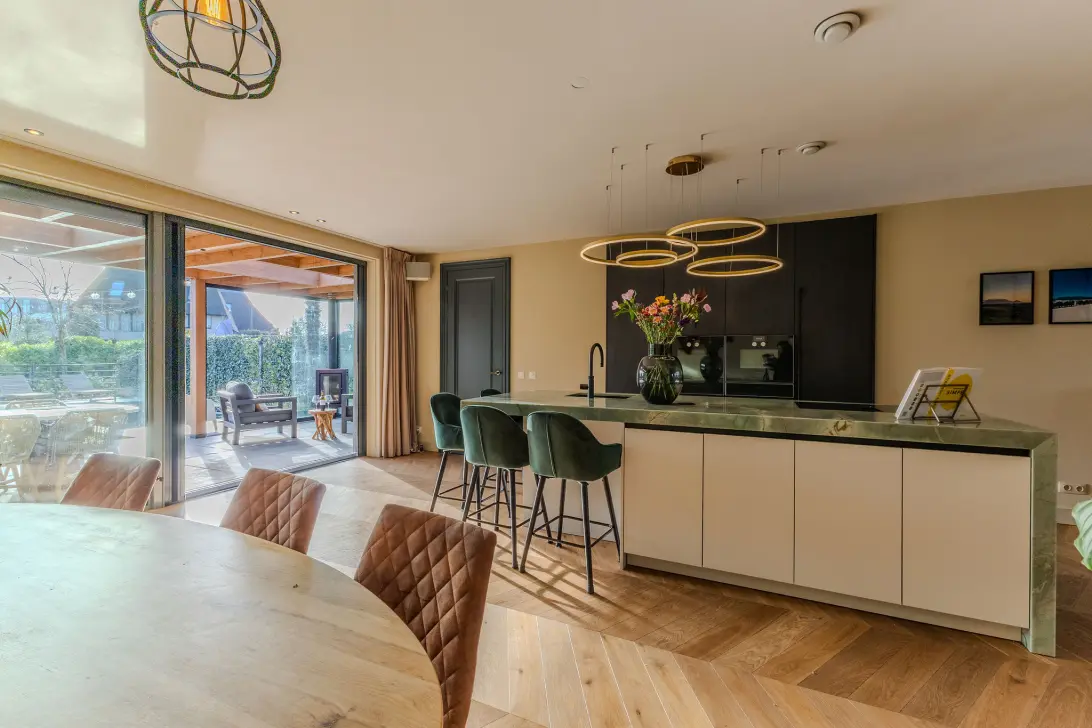 Het oog wordt direct getrokken naar de achterzijde van het huis: de zicht op de tuin en de hoeveelheid licht, in combinatie met de chique keuken: alles komt hier samen. De open keuken is gerust luxe te noemen en is voorzien van een Quooker met bruiswaterfunctie, Gaganau oven en combi-stoomoven, grote ijskast met 0-graden lade, vaatwasser, inductiekookplaat met recirculatie afvoer. Het eiland is afgewerkt met een uniek doorlopend kwartsiet aanrechtblad. Het heeft een mooie uitstraling, maar is ook functioneel met genoeg opbergruimte: de droom van iedere kookliefhebber. De geïsoleerde deur naar de bijkeuken biedt nog meer opbergruimte en het is ook een tweede entree voor bewoners.