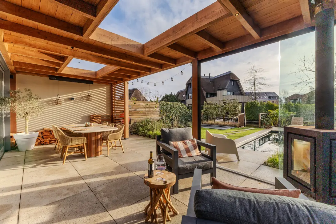 - Veranda met buitenhaard, verwarmd zwembad met elektrisch lamellendek en buitendouche;
