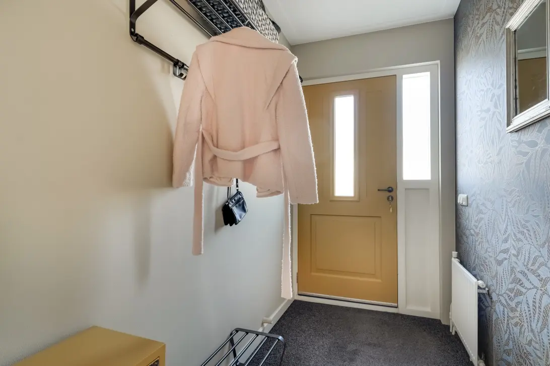 Vanuit de gang heeft u toegang tot de badkamer, nette toiletruimte, hal, twee slaapkamers en de berging. Vanuit beide hallen, alsmede berging is er toegang tot de tuin. De badkamer is volledig betegeld in lichte kleurstelling en is voorzien van een ruimte inloopdouche, dubbele wastafel en designradiator. De berging biedt voldoende bergruimte voor het opbergen van uw spullen. Hier treft u tevens de opstelling van de wasmachine en droger.
