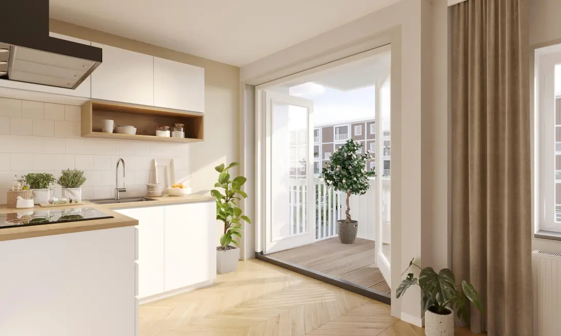 Vooral in het woongedeelte merk je direct dat dit een hoekappartement is. Openslaande deuren en ramen aan twee zijden zorgen voor veel natuurlijk licht in de woonkamer. En dan hebben we het Franse balkon nog niet eens genoemd. Wie wordt daar niet vrolijk van?