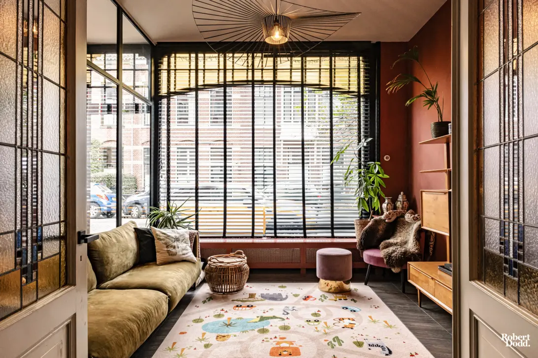 Er zijn maar twee van deze gevels in de straat, namelijk deze voormalige melkwinkel en de naastgelegen voormalige bakkerswinkel. Door de oorspronkelijke winkelfunctie heeft de woning een niet-alledaagse indeling met aan de voorzijde een klassieke voorkamer (de voormalige winkel) met suitedeuren naar de rest van de begane grond. In 2018/2019 verbouwd tot een moderne, lichte leefruimte die de sfeer ademt van een gezellig en levendig thuis. De eetkamer en luxe keuken vormen het hart van het huis, met aan de voorzijde een aparte speelkamer en aan de achterzijde de lichte aanbouw. Met een grote lichtstraat en grote schuifdeur naar de tuin, een fijne zitkamer en werkplek. De trap naar boven is meer achterin de woning te vinden, ook dit vindt zijn oorsprong in de originele functie als winkel met achterhuis en bovenhuis. Een familiehuis is het dus altijd geweest; het gezin van de winkelier woonde achter en boven de winkel.