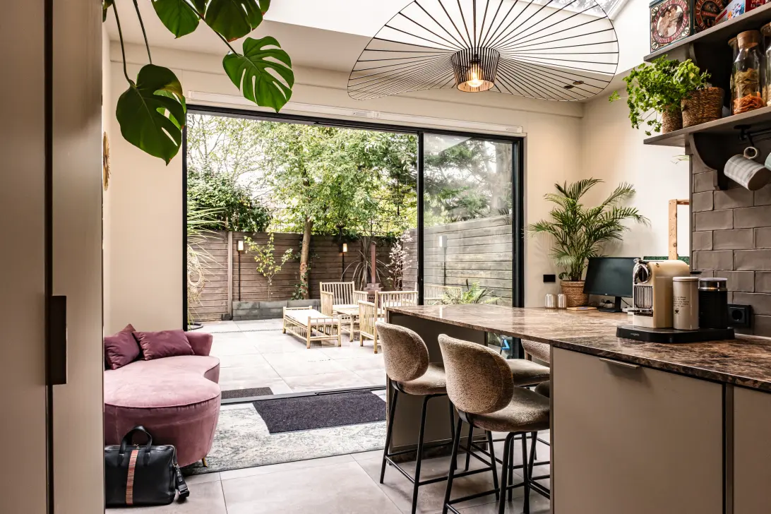 Klassieke entree in moderne hal met glazen wand en meterkast (15 groepen). Stalen taatsdeur naar het woongedeelte. Eetkamer met vaste kasten en atrium met daklicht en rondom glazen wand met zwart staal. Suitedeuren naar zitkamer/speelkamer aan de voorzijde met klassieke winkelpui met glas-in-lood. Luxe open keuken met veel werk- en kastruimte, ontbijtbar voor 4 personen en verder voorzien van Liebherr-wijnkoelkast, Bosch-magnetron en oven, Siemens 5-fasen inductiekookplaat, afzuigkap, koelkast, vriezer, twee vaatwassers en verzonken spoelbak met zwarte Quooker-kraan. Zitkamer aan de achterzijde met grote lichtstraat, thuiswerkplek en stalen schuifdeuren naar de achtertuin. Fraai aangelegde achtertuin met grote tegels, dezelfde als in de badkamer. Toilet met fontein en verlichting met sensor. Bergruimte onder de trap.
