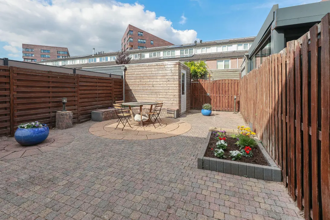 You enter through a spacious hallway with the meter cupboard and a separate toilet with a washbasin. There is plenty of storage space under the stairs. From the hall, you enter the very spacious living room and the well-maintained open kitchen. The size and light of the living room are immediately noticeable. At the front, you’ll find the large kitchen equipped with various built-in appliances. The kitchen also offers ample storage space with both upper and lower cabinets. Thanks to the generous layout and size of the kitchen, it’s possible to place a large dining table here. From the living room, you can access the large backyard through a sliding door, which can also be reached via a rear entrance. At the back of the garden, there’s also a spacious storage shed.