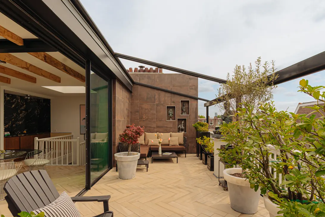 De bovenste verdieping biedt een open, loftachtige ruimte met een tweede keuken in marmer en directe toegang tot het royale dakterras. Binnen en buiten lopen hier naadloos in elkaar over. Het zonnige terras, voorzien van elektrisch zonnescherm, biedt volop ruimte voor diners en borrels, of om in alle rust te genieten van het uitzicht over de stad. Daarnaast bevindt zich hier een aparte was- en strijkkamer met veel ingebouwde kastruimte. Het is ook mogelijk hier een tweede of zelfs derde badkamer te realiseren mocht u dat willen.