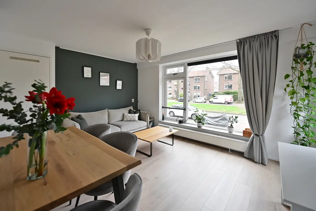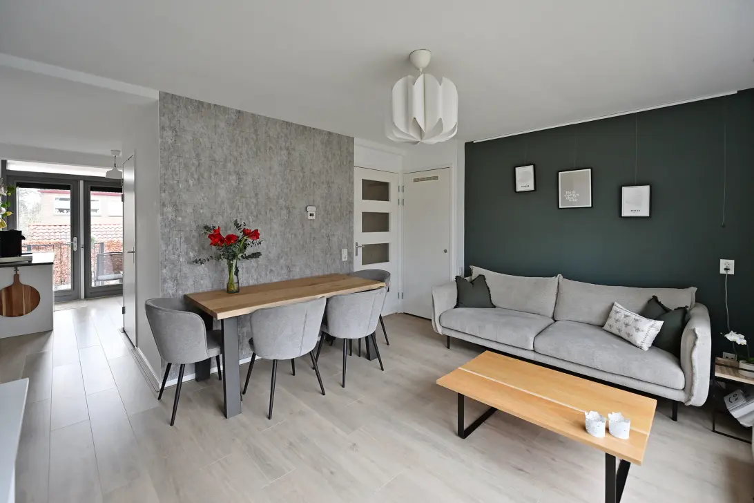 De lichte woonkamer is strak en modern afgewerkt en biedt een prettige leefruimte met uitzicht op de groene omgeving. Dankzij de grote ramen is er veel natuurlijke lichtinval, wat zorgt voor een open en frisse sfeer.