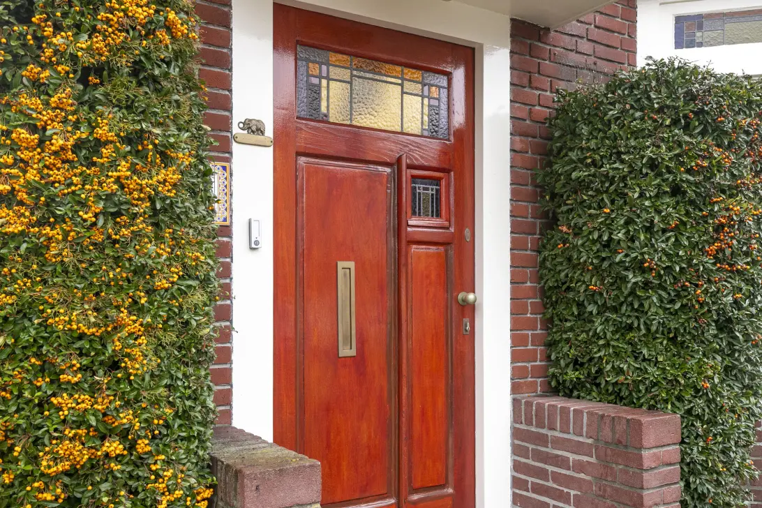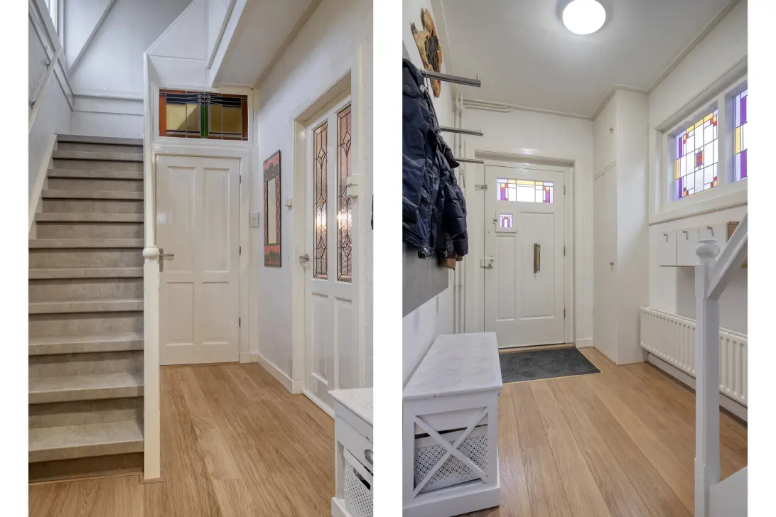 Entree, hal met schitterende lichtinval door het glas in lood, trapopgang en toiletruimte. Vanuit de hal bereik je de fijne woonkamer met een cassetteplafond, erker, glas in lood en openslaande tuindeuren. De open keuken is voorzien van een L-vormige unit met diverse inbouwapparatuur. Via de keuken is de functionele bijkeuken met bergruimte, wasmachine- en droger opstelling en de CV ketel bereikbaar. De grote verwarmde garage is binnendoor bereikbaar en geeft tevens toegang tot de heerlijke tuin.