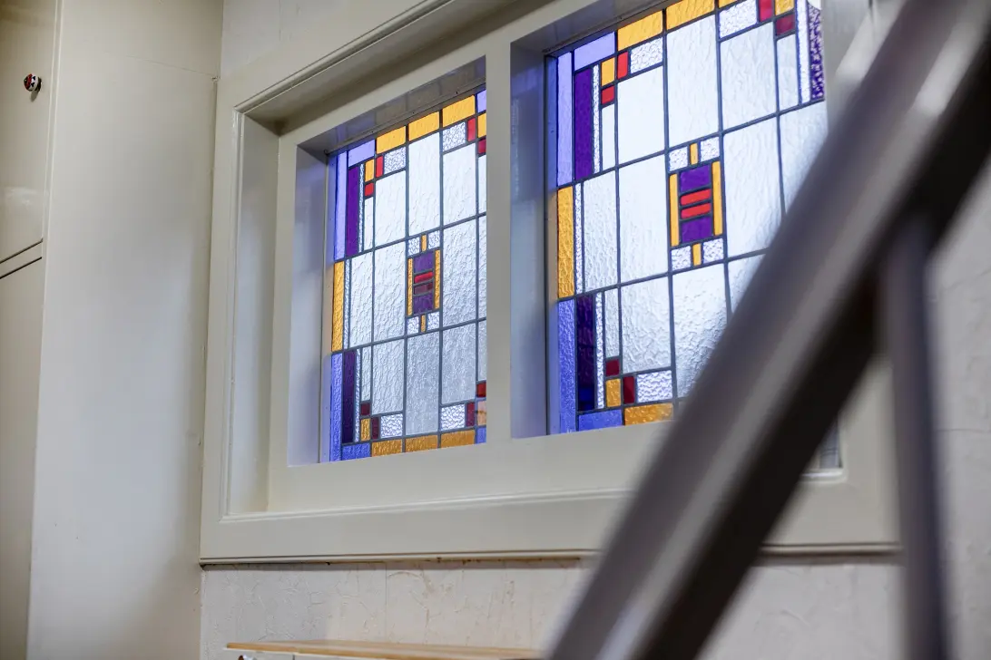 • Woonkamer met een erker, glas in lood en een cassette plafond