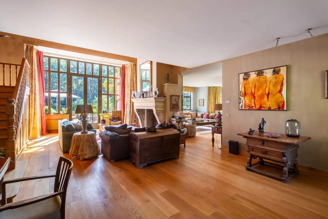 Er is een zeer ruime living met grote open-haard en een prachtige raampartij waardoor binnen en buiten één geheel vormen. Er is een speelse tv-kamer met open-haard en aangrenzend een kantoor met ingebouwde bibliotheek. Deze kan door middel van schuifdeuren afgesloten worden.