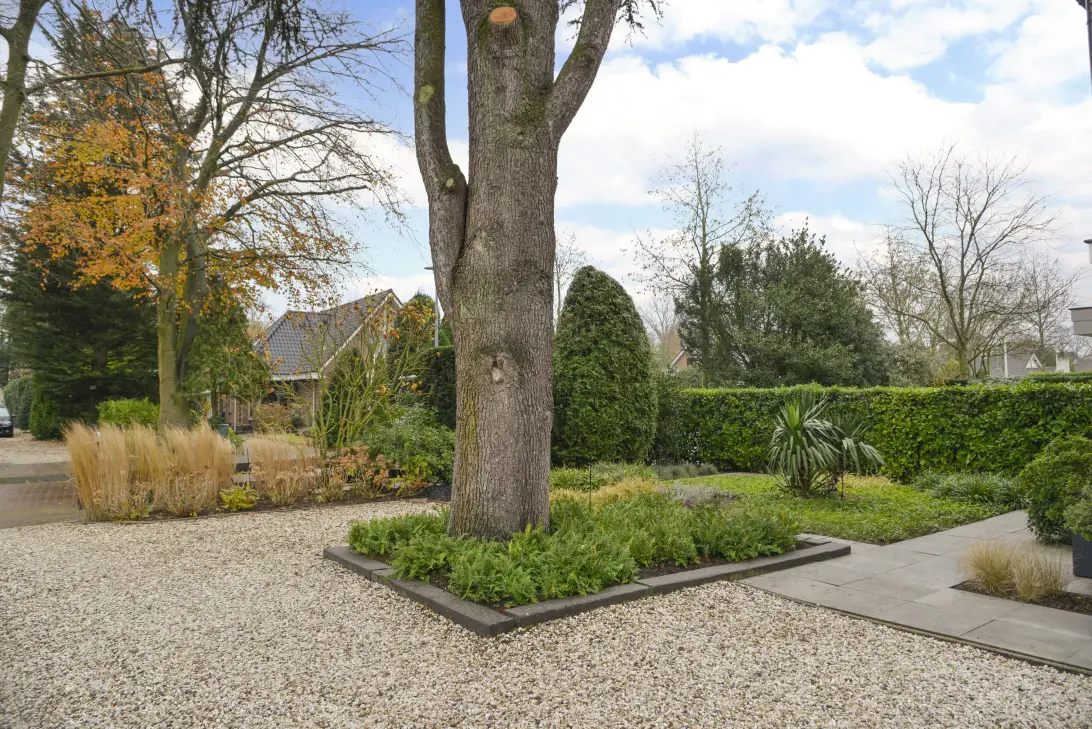 De fraai aangelegde achtertuin op het zuiden biedt optimaal privacy, meerdere zonneterrassen, een schitterende veranda met verlichting en een separate berging. De voortuin is strak en stijlvol aangelegd en biedt ruimte om meerdere auto’s op eigen terrein te parkeren.