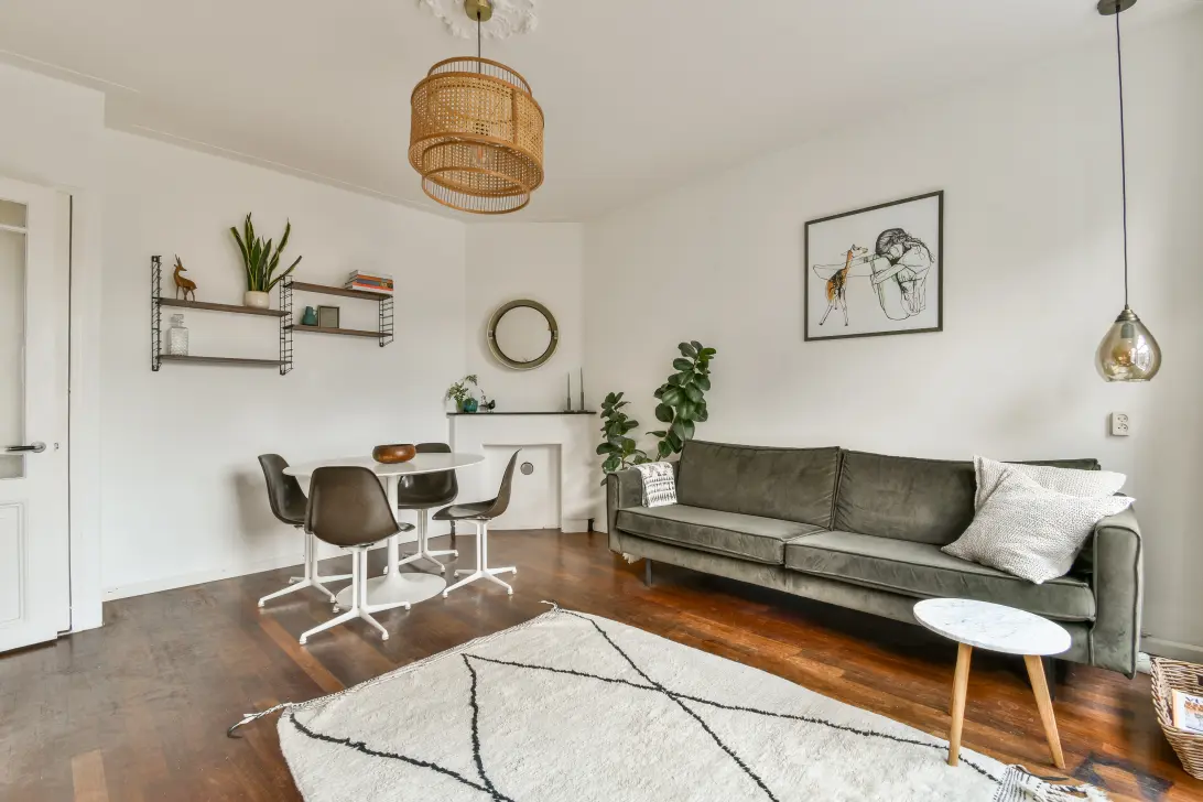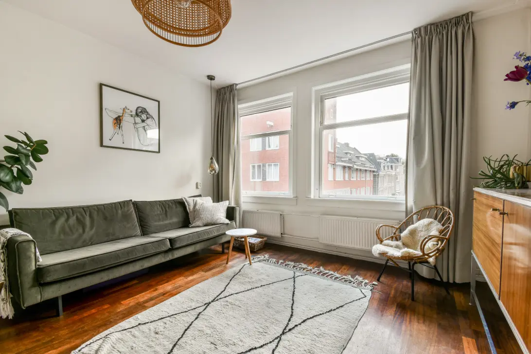 - Lichte woonkamer met uitzicht in de lengte van een rustige, groene straat;