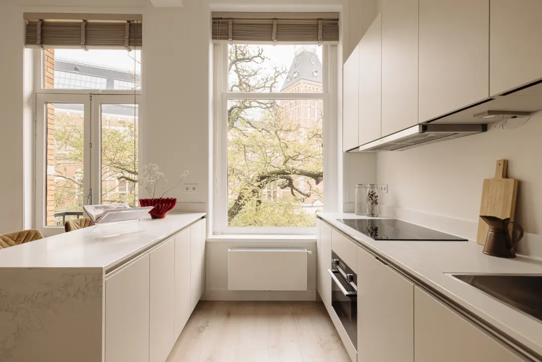 The kitchen is an elegant combination of sleek design and functionality, with a long worktop and a central island. The open layout ensures a seamless transition between cooking, dining, and relaxing. From the seating area, you always have a beautiful view of the city, with the impressive façades of the Rijksmuseum as a backdrop. At the rear of the apartment are two peaceful bedrooms, each with access to its own bathroom. The master bedroom is a serene space with French doors opening onto the balcony, an ideal spot for rest and reflection. The en suite bathroom is spacious and carefully designed, featuring a walk-in shower, double sink, and second toilet, all in a minimalist palette of beige and white. The second bedroom has its own bathroom, finished with the same level of quality and care, including a walk-in shower and sink. The rear balcony offers a tranquil escape, surrounded by green trees that provide shade in the summer. This is the perfect place to relax, enjoy a cup of coffee, or unwind in the evening while overlooking the city. Due to its location and orientation, the balcony feels like an extension of the home, with the city always in sight yet the calm of the green surroundings close at hand.