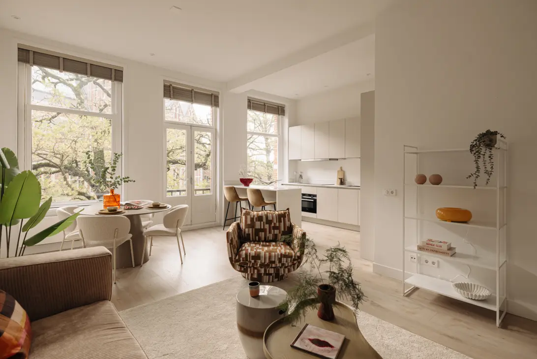 This charming apartment is located in one of Amsterdam’s most sought-after neighborhoods and offers a breathtaking view of the Rijksmuseum. The living room spans the full width of the front façade, allowing light to flood the space and creating a calm atmosphere. The three large windows not only offer a panoramic view of the city but also open onto the French balcony, bringing the street and outdoor life close by. This effect is enhanced by the sunlight streaming in, making the room feel as if it is connected to the city itself.