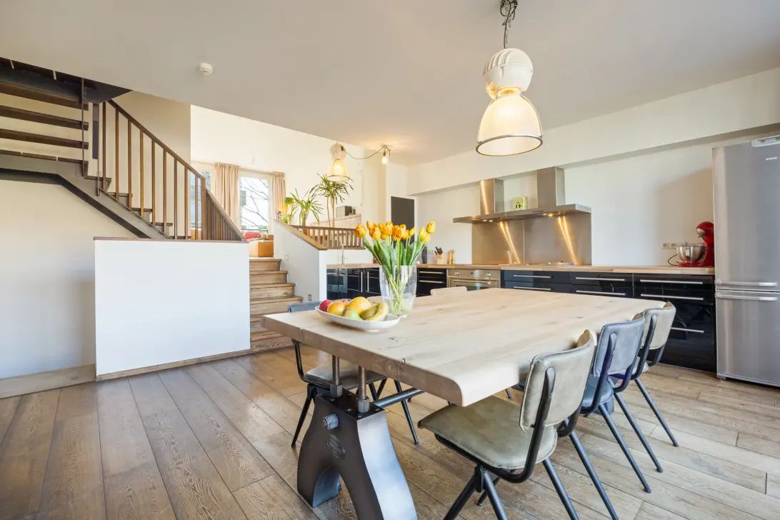 Prachtig, centraal gelegen trappenhuis, open woon-/leefkeuken voorzien van diverse inbouwapparatuur waaronder een quooker, ruime lichte living voorzien van open haard en ramen die geheel open kunnen.