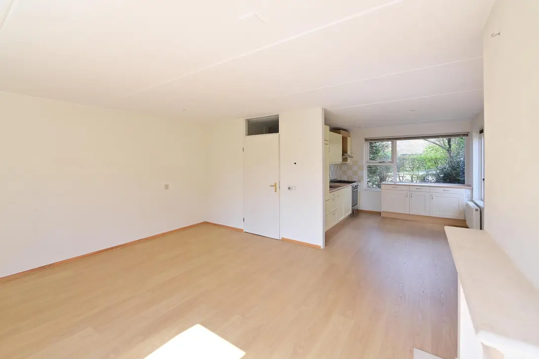 Entree met meterkast, toilet met fonteintje, bergkast, lichte L-vormige woon/eetkamer voorzien van nieuwe laminaatvloer, mooie schouw met open haard, airconditioning en toegang tot een extra werkkamer. Vanuit deze kamer is er een deur naar de zonnige achtertuin. De open keuken is gesitueerd aan de straatzijde en is voorzien van een koelkast, vaatwasser, gasfornuis met oven en afzuigkap.