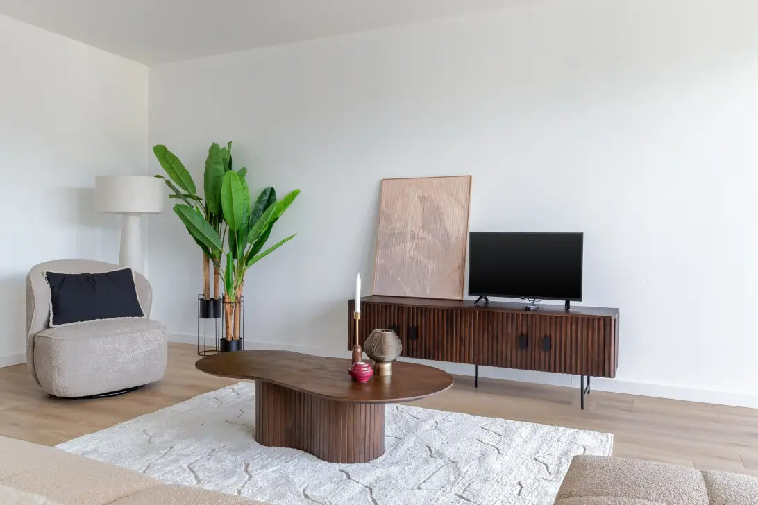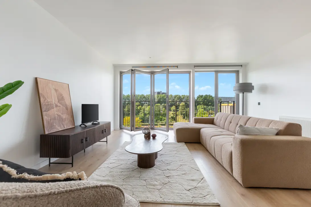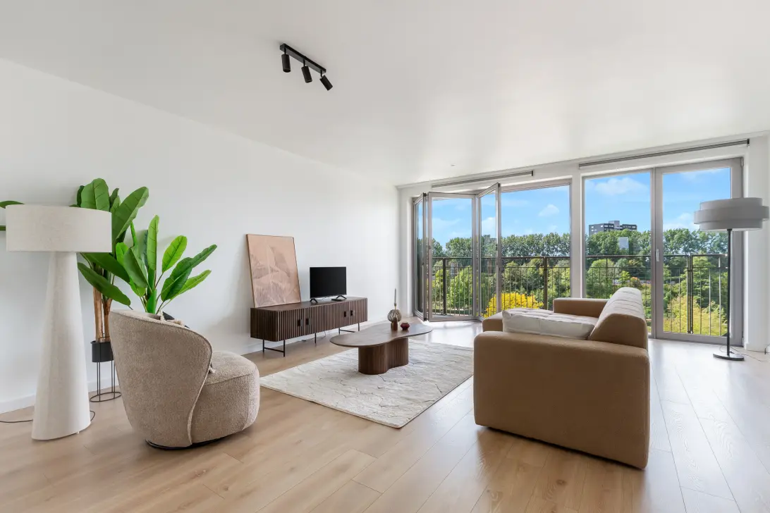 De royale woonkamer is bijzonder licht dankzij de doorzonindeling en biedt toegang tot het balkon via openslaande deuren – een heerlijke plek om te genieten van het uitzicht en de zonsondergang, ideaal voor zwoele zomeravonden.