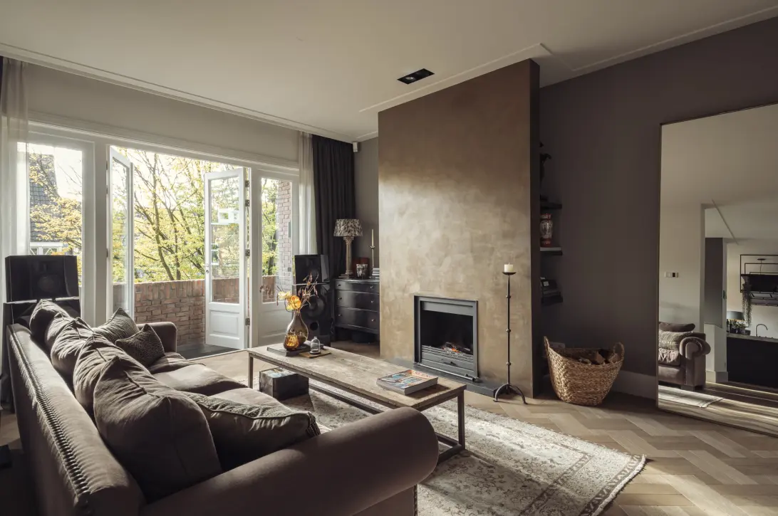 During the renovation, the apartment was completely stripped back to its structural shell. Within the existing load-bearing walls, and under the guidance of Den Older–Vleugels Architects, an entirely new, high-quality and exclusive residence was realised. The layout was fundamentally redesigned, resulting in improved circulation and optimal living comfort. As part of the renovation, a SieMatic kitchen was installed, equipped with high-end Gaggenau appliances, including a wine climate cabinet. New oak staircases were added and the residence was finished with a solid oak (Soares) parquet floor with underfloor heating. For optimal comfort, KNX and Crestron home automation systems were installed to control lighting, sound and temperature. All four bedrooms are fitted with Daikin split air-conditioning units, and Modular lighting is applied throughout the residence. A wood-burning fireplace by Jos Harm adds warmth and character. In addition, all drainage systems, water pipes, electrical installations and the roof covering were fully renewed. The residence is fitted with HR++ glazing in entirely new and heavier window frames, ensuring a future-proof home and resulting in an energy label A.