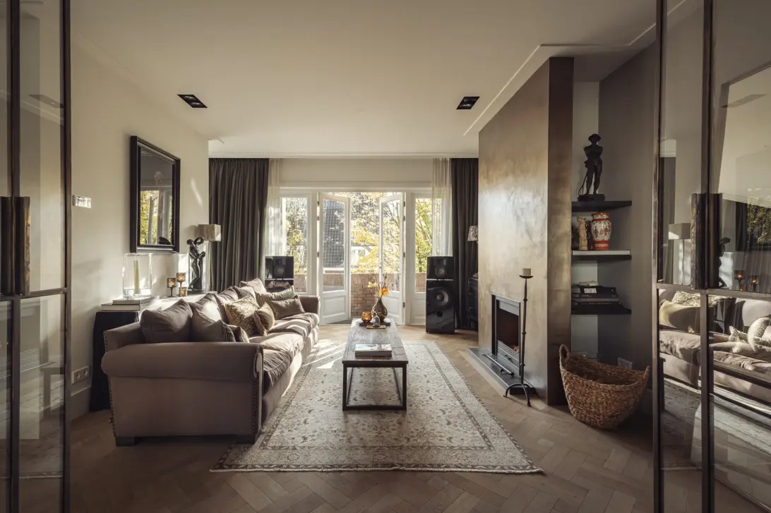 Van Eijck de Luxe | Along an elegant and spacious street in Amsterdam Zuid lies this beautifully renovated and luxurious upper residence of approximately one hundred ninety-four square metres, arranged across two living levels with a private entrance. The ground lease has been bought off in perpetuity, and the property holds an energy label A. The apartment features a private entrance from the street with a secure “airlock,” created by an additional reinforced door on the first floor, enhancing both independence and privacy.