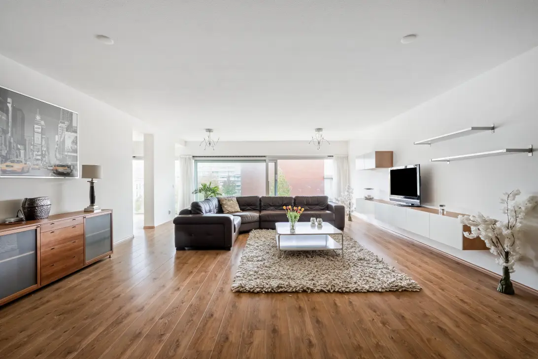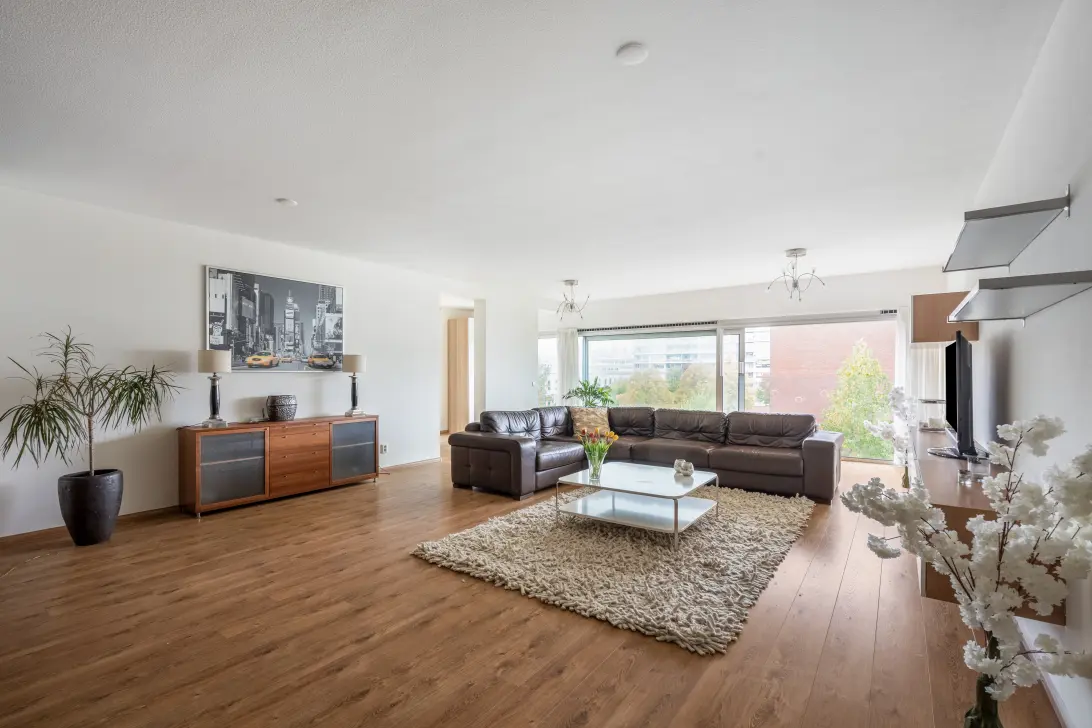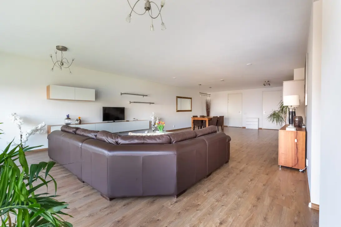 De lichte en bijzonder ruime woonkamer is direct een indrukwekkende binnenkomer. Met een oppervlakte van circa 70 m² biedt deze kamer enorm veel ruimte. De open keuken vormt samen met de woonkamer een perfecte setting voor gezellige avonden. De nette laminaatvloer met vloerverwarming draagt bij aan het comfort. Vanuit de woonkamer heb je een prettig uitzicht op de omgeving.