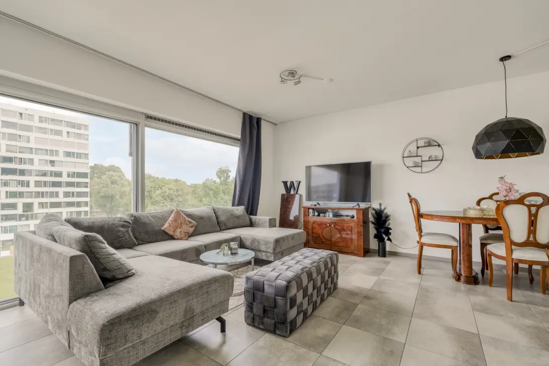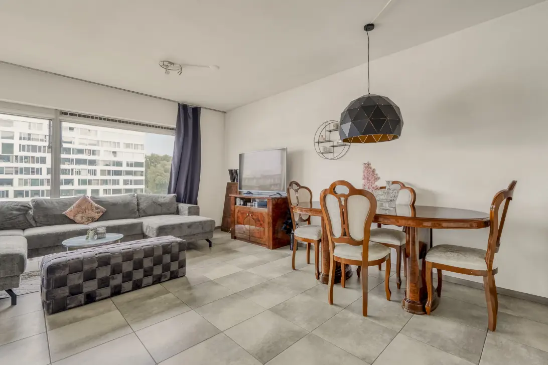 Through the hall, you reach the living room. This is spacious and features numerous high windows. The apartment faces east and is neatly finished. The tiled floor has underfloor heating, and the walls are finished with plaster. Adjacent to the living room is the patio, which is integrated into the living room. This patio can be closed off with a glass concertina door.