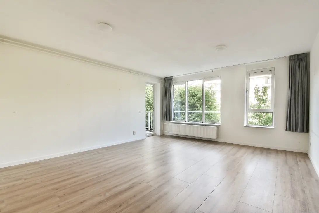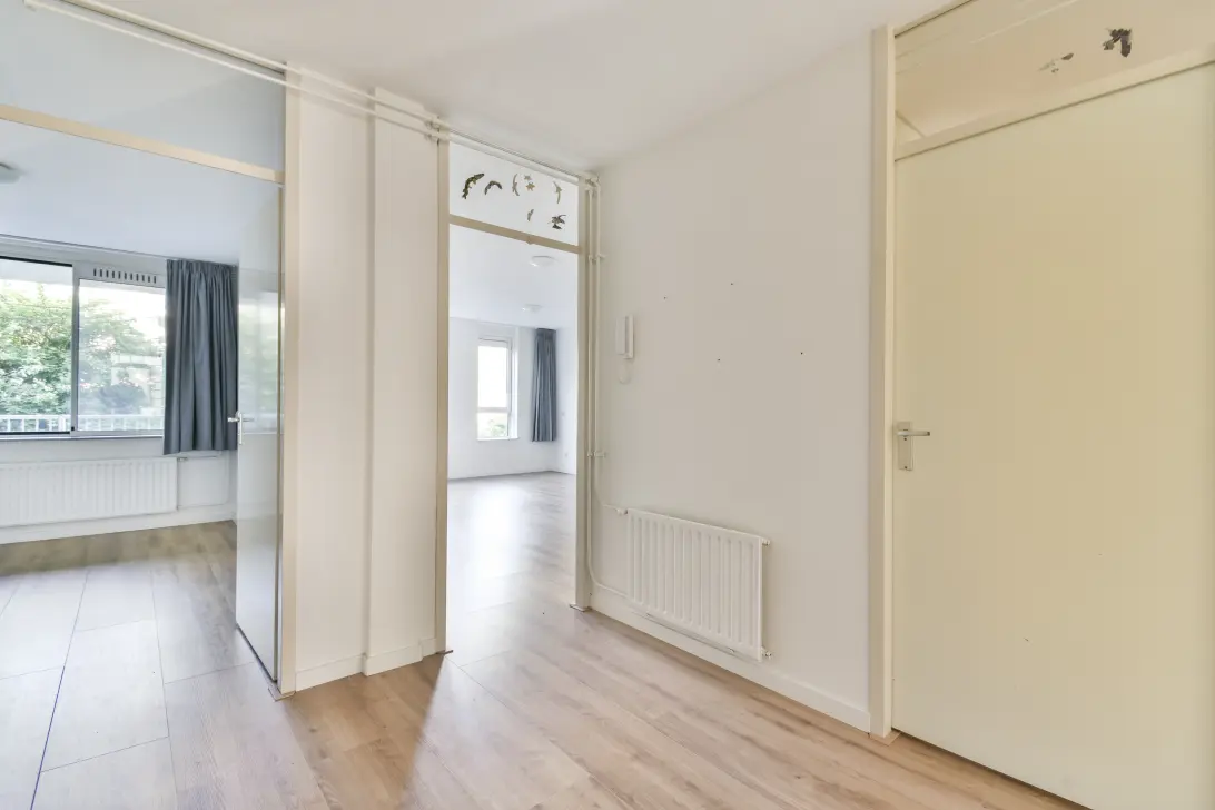 Thanks to the large windows, the apartment is filled with natural light and offers unobstructed views of greenery. The layout is efficient and offers plenty of possibilities: currently there are two well-sized bedrooms, but with a simple adjustment, you can create a third bedroom by relocating the kitchen toward the living room. See the alternative floor plan for inspiration.