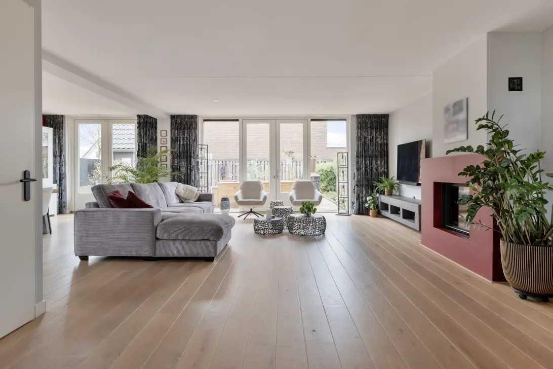 Ground floor: Via the front garden you reach the entrance of the home. The entrance hall, with the meter cupboard and a small toilet with a basin, provides access to the spacious living room with an open kitchen. The generously proportioned kitchen, at the front, is fitted with a modern installation featuring a marble countertop and various built-in appliances such as a 5-burner induction cooktop, extractor hood, oven, microwave, dishwasher, and fridge-freezer combination. In 2023, the kitchen was wrapped. The very spacious living room with a fireplace flows seamlessly into the generous side room. This side room, with French doors at both the front and back, offers a beautiful view of the side garden through its windows. The French doors in the living room and side room give access to the beautifully landscaped, sunny garden with plenty of privacy. In the extra wide garden, also accessible via a rear entrance, there is a stone shed with electrical installations. A property-wide sunshade at the rear of the house provides pleasant shade when desired.