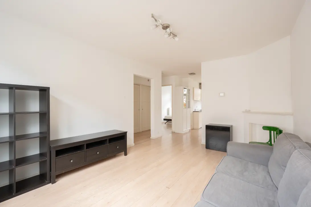 Als we rechtsaf slaan komen we in de gezellige woonkamer, gelegen aan de voorzijde van het appartement.