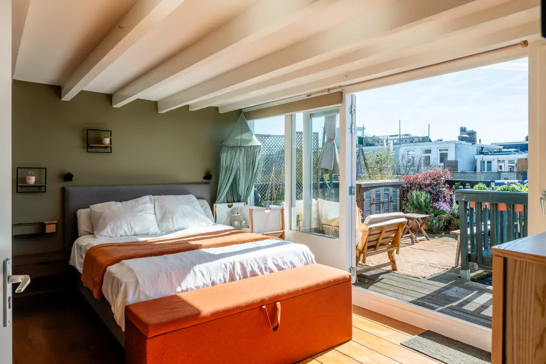 Vanuit de master bedroom is er toegang via openslaande deuren tot het dakterras van maar liefst ca. 16 m2 welke is gelegen op het zuiden. Doordat het de vierde en hoogste verdieping betreft kun je hier de hele dag van de zon genieten. Het is een ware daktuin waar je ook in het voor- en najaar al goed kunt vertoeven.