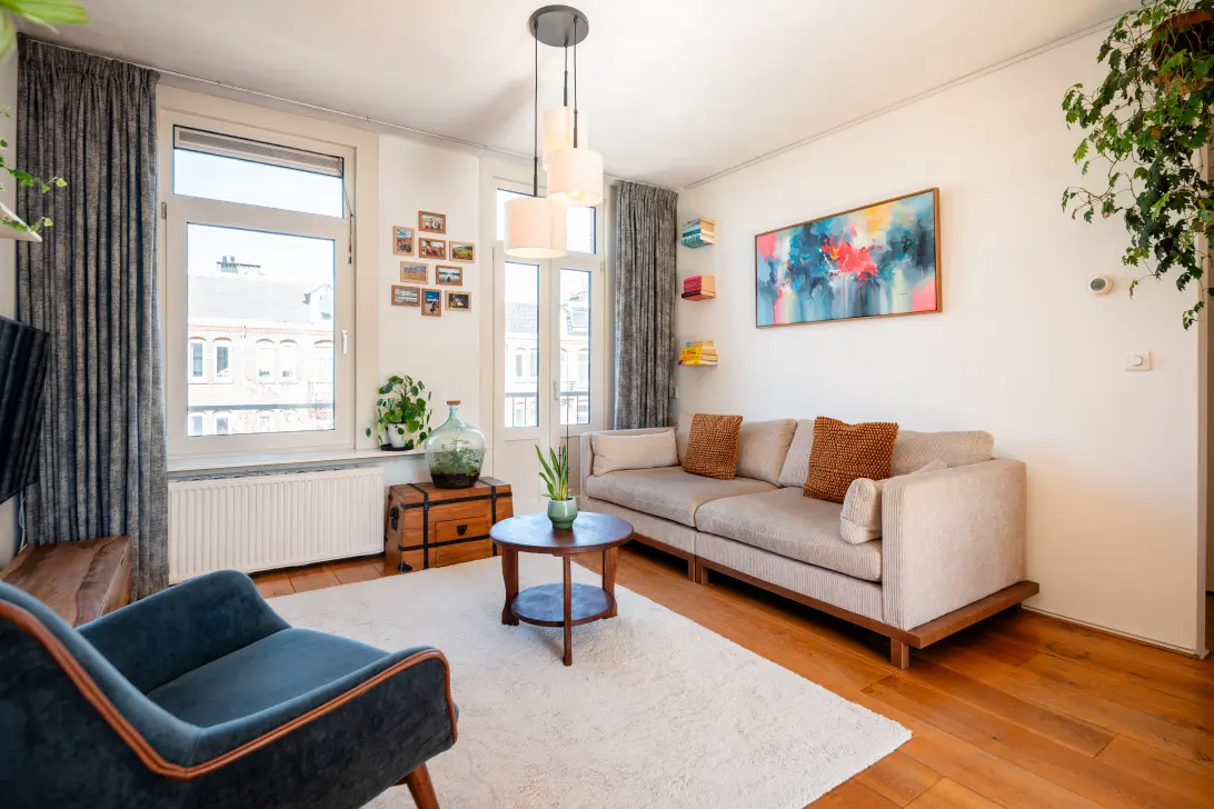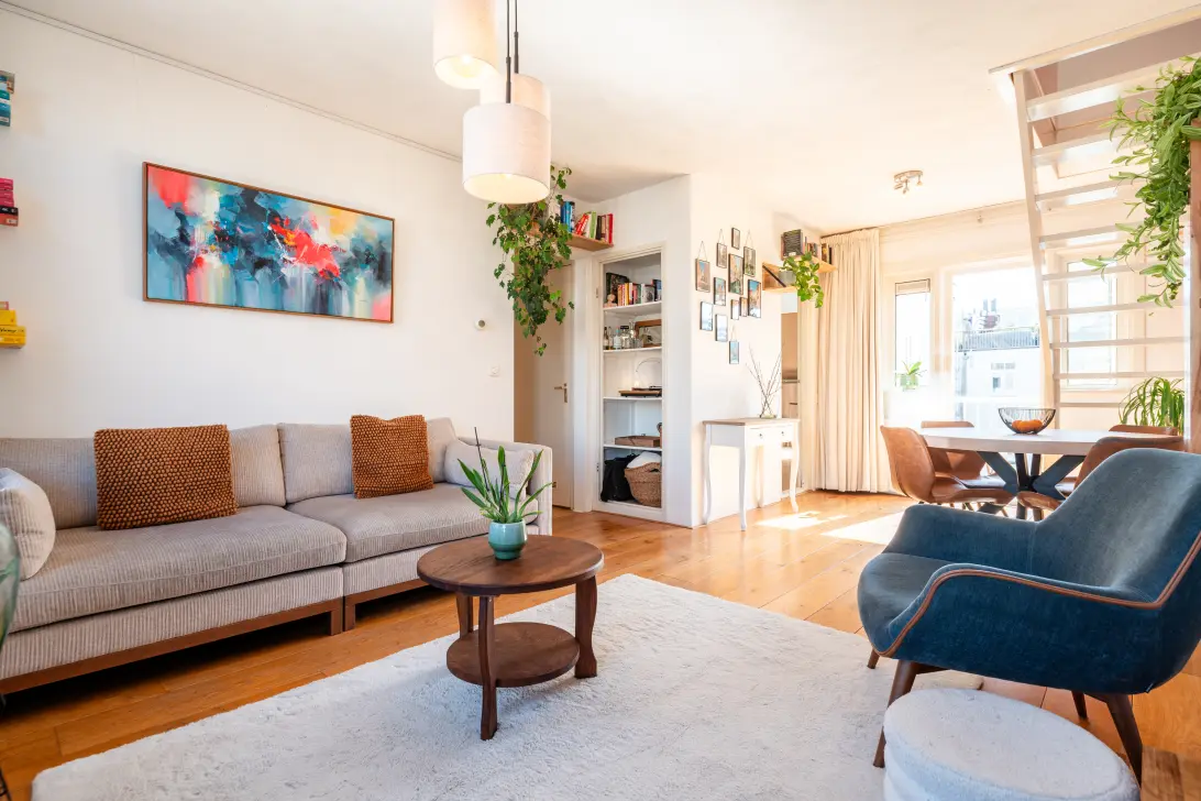 This 3-bedroom apartment, located in a charming building on Javastraat, is available on FREEHOLD and offers approximately 69 m² of living space. The apartment features a playful layout spread over two floors and boasts approximately 20 m² of outdoor space in the form of a balcony and a rooftop terrace. Air conditioning in the master bedroom, 6 private solar panels, a spacious kitchen-diner, and a second bedroom/study make this a pleasant and comfortable apartment.